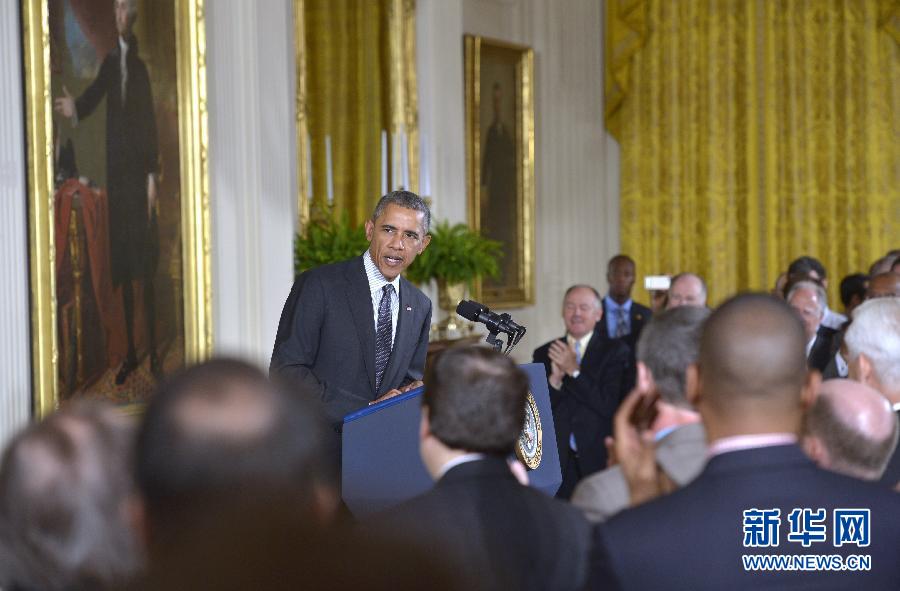 6月29日,在美国首都华盛顿白宫,美国总统奥巴马在签署法案前讲话。美国总统奥巴马29日签署贸易促进授权法案,给予美国政府“快速道”授权,以推动跨太平洋战略经济伙伴协定(TPP)谈判取得进展。新华社记者殷博古摄