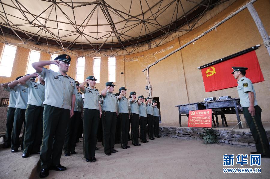当日,呼和浩特边防检查站50余名官兵来到位于呼和浩特市武川县得胜沟乡蘑菇窑村的大青山抗日游击根据地展馆,开展“重走革命圣地,党旗在我心中”主题学习活动。边防官兵们在展馆内重温入党誓词,慰问当地老党员,聆听老党员讲述革命故事。新华社发(连振 摄)