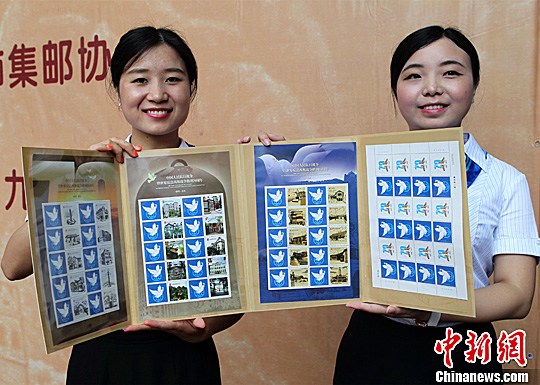 图为工作人员展示发行的《和平鸽》个性化专用邮票。周毅 摄