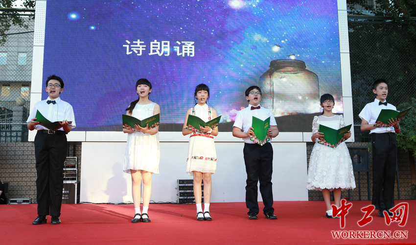 2015年7月2日晚上6点,芳草地国际学校日坛校区的09届毕业生在学校操场,举行了“让梦想从芳草起航”六年级毕业典礼。日坛校区的领导、老师、家长们出席了此次活动。芳草地的教师们用泪水送别可爱的学生,祝愿同学们一定会扬起人生的风帆,奔赴更远的旅途,让梦想从芳草起航。图为诗朗诵《奔跑吧 芳草学子》六年级毕业生。 (中工网记者 毛邓摄 通讯员 芳草地张睿)