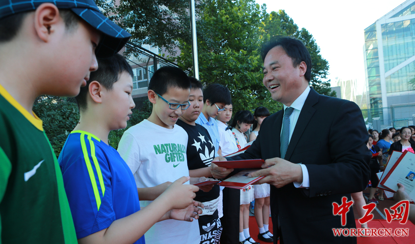2015年7月2日晚上6点,芳草地国际学校日坛校区的09届毕业生在学校操场,举行了“让梦想从芳草起航”六年级毕业典礼。日坛校区的领导、老师、家长们出席了此次活动。芳草地的教师们用泪水送别可爱的学生,祝愿同学们一定会扬起人生的风帆,奔赴更远的旅途,让梦想从芳草起航。图为刘飞校长为毕业生颁发毕业证书。 (中工网记者 毛邓摄 通讯员 芳草地张睿)