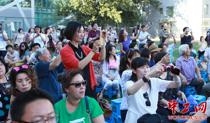 2015年7月2日晚上6点,芳草地国际学校日坛校区的09届毕业生在学校操场,举行了“让梦想从芳草起航”六年级毕业典礼。日坛校区的领导、老师、家长们出席了此次活动。芳草地的教师们用泪水送别可爱的学生,祝愿同学们一定会扬起人生的风帆,奔赴更远的旅途,让梦想从芳草起航。图为参加毕业典礼的学生家长。 (中工网记者 毛邓摄 通讯员 芳草地张睿)