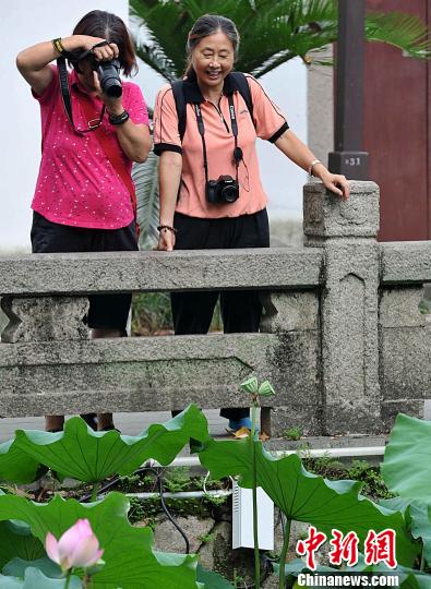 7月6日,福州西湖公园荷花池内,一支并蒂莲吸引了许多市民前来观赏并拍照。 张斌 摄