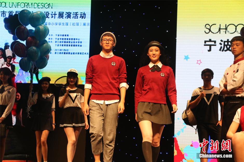 7月8日,在首届宁波市学生服设计展演活动中,来自宁波17所中小学的同学们穿上由教师、学生及家长共同参与设计的学生服亮相T台。前沿的设计和个性化造型使校服一改单调之风,展露出时尚个性的因子,打破了运动式校服“一统江湖”的局面。中新社发 李佳赟 摄