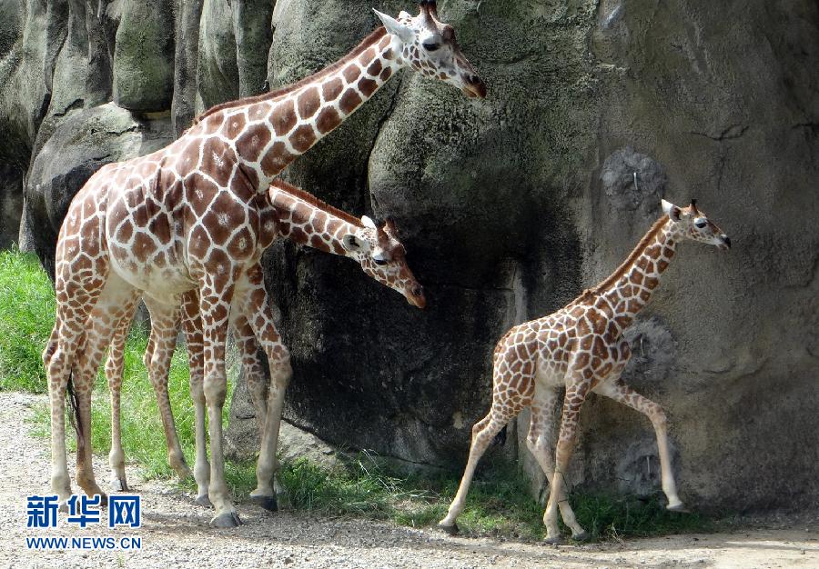 7月8日,长颈鹿宝宝“宵璋”同家族成员在户外活动。今年5月13日于台北市动物园诞生的雄性长颈鹿宝宝“宵璋”即将年满两个月,体重也从62公斤增长到103公斤。近日,保育员尝试让“宵璋”跟着家族成员一起到户外活动,初次同家族成员接触的“宵璋”看到同类还较为“羞涩”。新华社发
