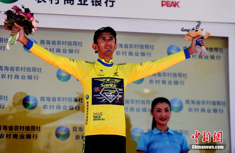 本赛段,台北RTS森地客队的候赛因在队员配合下发挥出色,穿上象征总成绩第一的“黄衫”。图为侯赛因赛后庆祝胜利。 胡贵龙 摄
