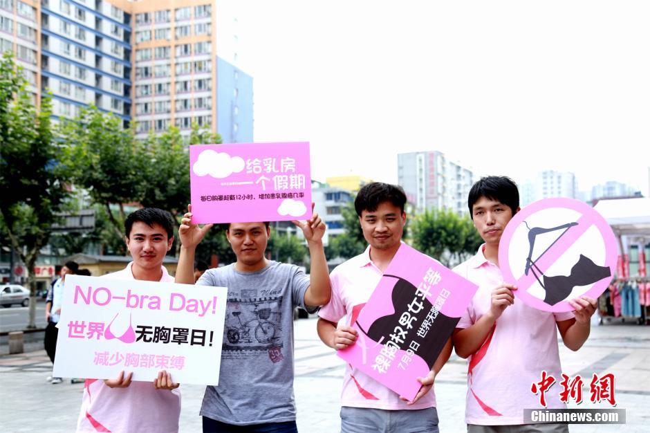 许多受访女性表示,在外不穿胸罩肯定引起他人恻目相看,因为我们的社会还是相对保守的,但为了自己的健康,其实可尽量在家里不穿胸罩,那么天天都是“无胸罩日”。有调查指出,世界上80%的女性戴着不合适的胸罩。那些因长时间戴胸罩而患上乳腺病的女性,十有八九是因为选择的胸罩不合适。对此,成都蜀都乳腺医院副主任医师汪晓阳建议,首先,女性一定要选择佩戴穿着舒适的胸罩;其次,如果因工作需要或在公共场合佩戴胸罩时间长的,尤其在12小时以上者,应选择面料透气、束缚力不强的胸罩;此外,每天下班回家后,或假日里不去公共场所时,可尽量解开胸罩,让乳房“有张有弛”。图为男性志愿者在这一天也自愿呼吁“裸胸权男女平等”。 刘彦君 摄