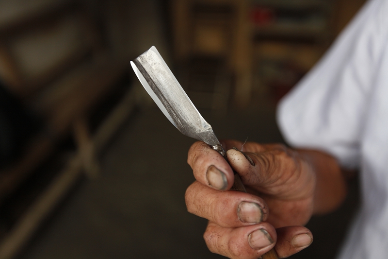 这把刀是赖学贤学艺的时候买的,当时买的时候只要几毛钱,到现在他已经用了50多年。中工网记者韩靖 摄