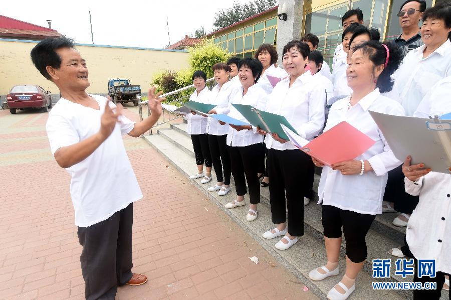 7月16日,赵发(左一)在教村民学唱他谱写的《二十七支队队歌》。今年76岁的赵发是河北省霸州市堂二里镇十四街的村民,多年来他一直义务宣传本镇的抗日英雄魏大光的事迹。为了让后人记住家乡这位抗日英雄,赵发还整理撰写了《热血男儿》纪实故事,谱写了歌曲《二十七支队队歌》,在当地广为传颂。魏大光曾任华北人民抗日联军第27支队司令员,冀中军区独立第5支队司令员,八路军120师独立2旅旅长等职。1939年在战斗牺牲,年仅二十八岁。新华社记者 李晓果 摄