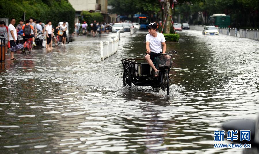 7月21日,一辆三轮车在被水淹没的道路上行驶。当日,浙江杭州暴雨倾盆。受瞬间强降雨的影响,杭州市中心多个路段被大水淹没,给市民通行造成很大影响。 新华社记者 王定昶 摄