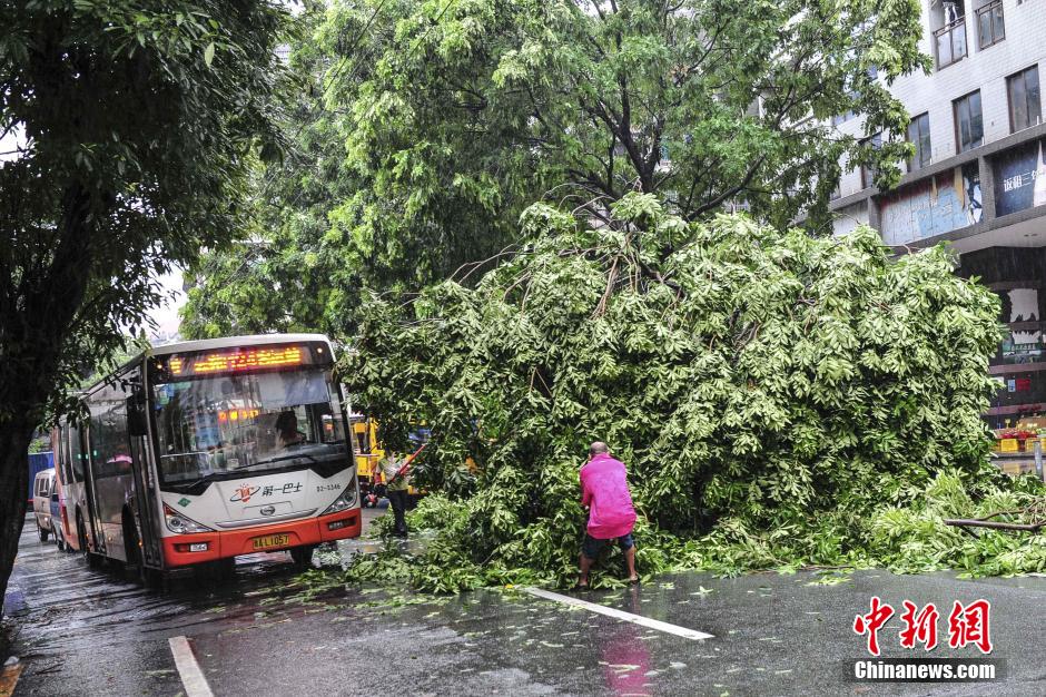 7月21日,广州城区遭暴雨突袭,大德路上一棵六七米高的大树在暴雨中倾倒,砸中一辆行驶中的公交车和小轿车,造成该路段两车道受阻,幸无人员伤亡。 中新社发 陈骥旻 摄