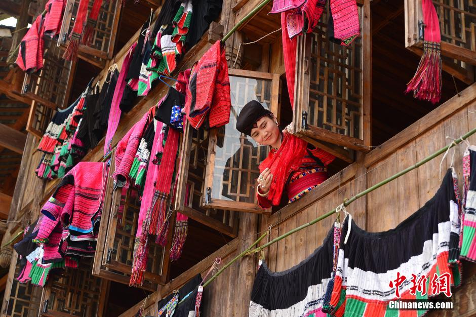 7月21日农历六月六,广西桂林市龙胜各族自治县龙脊金坑大寨村喜迎一年一度传统“晒衣节”,各家各户挂出一件件鲜艳夺目的红瑶服饰。当天,当地瑶族群众还上演大型红瑶服饰加工展示、千年红瑶药浴、红瑶传统婚礼、木匠工艺竞赛等民俗活动,吸引了上万游客和摄影爱好者前来参观体验。 中新社发 潘志祥 摄
