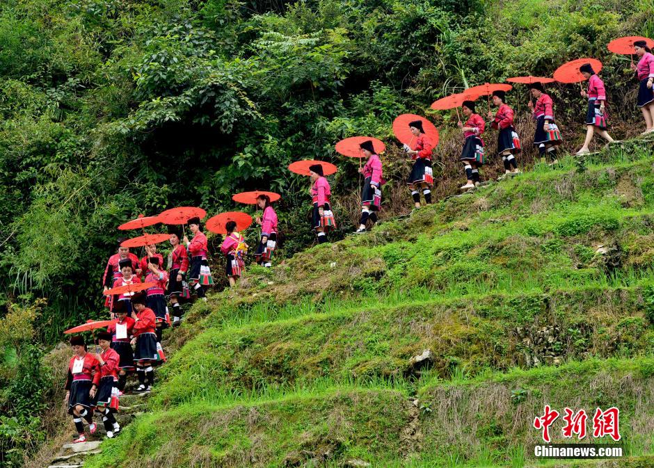 图为红瑶传统婚礼的送亲队伍。 中新社发 潘志祥 摄