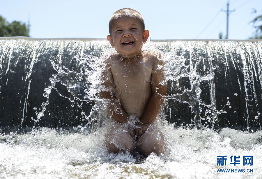 7月22日,在乌鲁木齐市珠江路附近的景观渠内,一名小朋友在戏水避暑。乌鲁木齐主城区最高气温仍突破40摄氏度。近一周以来,新疆大部地区持续出现近40℃的高温天气,一些地区气温已突破历史极值。 新华社记者王菲摄