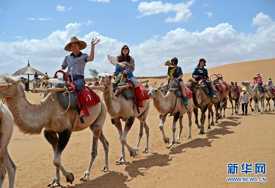 游客在宁夏中卫市沙坡头旅游区体验骑骆驼穿越沙漠项目(7月22日摄)。 7月份以来,宁夏进入沙漠旅游黄金季节,暑期旅游客流与开斋节小长假客流叠加,宁夏中卫市沙坡头景区等沙漠游线路迎来夏季旅游高峰,大漠黄河的雄浑景观吸引来自全国各地的游客前来观光游玩。新华社记者 王鹏 摄