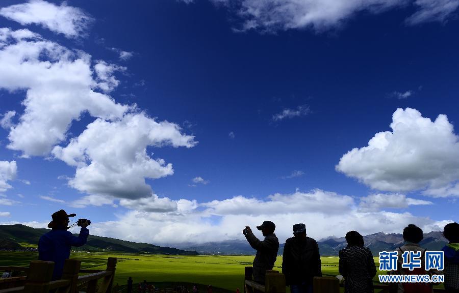 7月22日,游客在门源油菜花田的观花台上拍照。近日,青海省海北藏族自治州门源回族自治县近50万亩油菜花盛开,形成“百里油菜花海”的美景。 新华社记者张宏祥摄