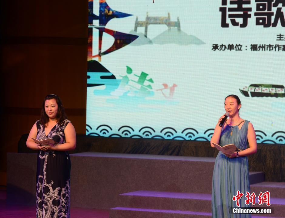 台湾青年诗人冯瑀珊(左)、大陆青年诗人秋水同台朗诵诗作。