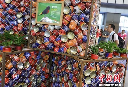 参观者被展出的用废弃空气灌组成的立体雕塑吸引,环保话题一直是户外运动的主题之一。 泱波 摄