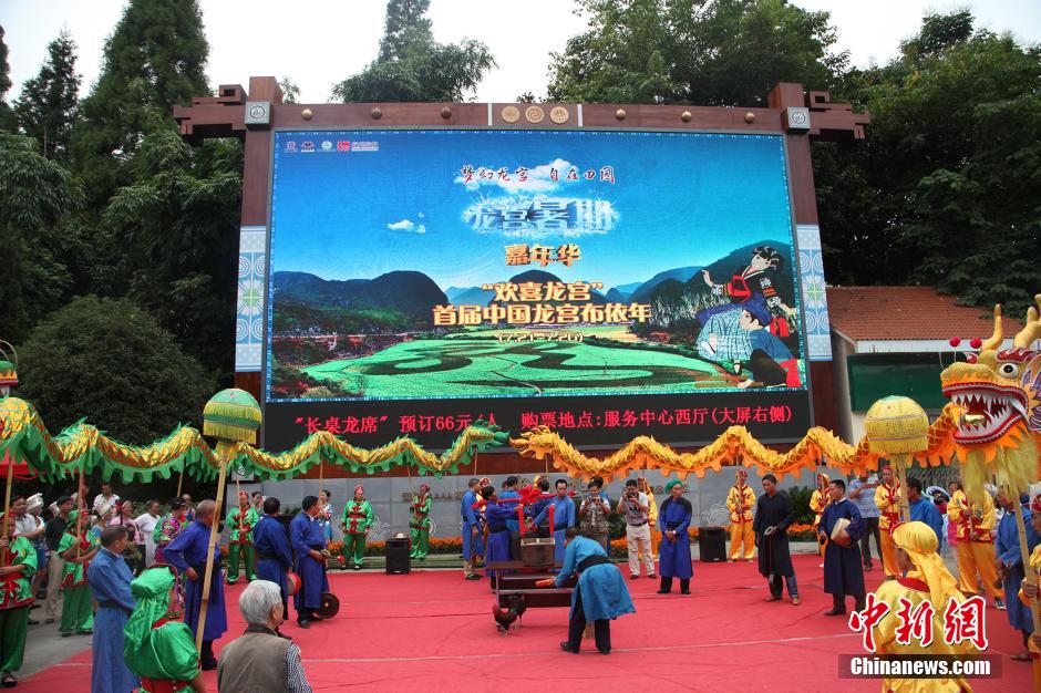 “首届中国龙宫布依年活动周”于7月21日至26日在贵州安顺龙宫景区举行,围绕‘梦幻龙宫,自在田园’主题,举行了“神龙”巡游祈福、万名布依坐龙席长桌宴、多民族共舞贺布依年、篝火晚会等诸多活动,游客不仅可以在盛夏畅游龙宫,还可以品尝龙宫泉煮过的粽子、体验独特的少数民族文化,与布依族等少数民族共度“新年”。图为舞龙祈福现场。 周娴 摄