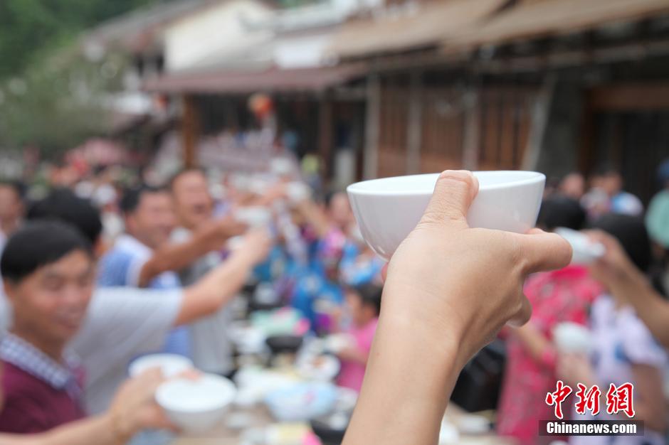 图为“万名布依坐龙席”长桌宴,游客与当地群众共举酒杯说“新年快乐”。 周娴 摄