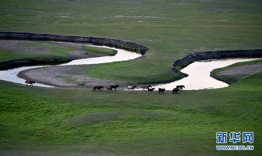 这是东乌珠穆沁旗满都宝力格镇乃林郭勒风光(7月24日摄)。盛夏时节,位于内蒙古中部的锡林郭勒大草原景色秀美。蜿蜒的河流、天空中的云朵、散落的蒙古包、“游动”的牛羊构成美丽的画卷,吸引众多游客前来观赏游玩。新华社记者任军川摄