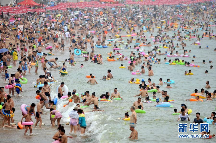 7月27日,游客在青岛沿海一处浴场戏水。近日,受酷暑高温天气影响,山东省青岛市沿海各浴场游客数量猛增。 新华社发(王海滨 摄)