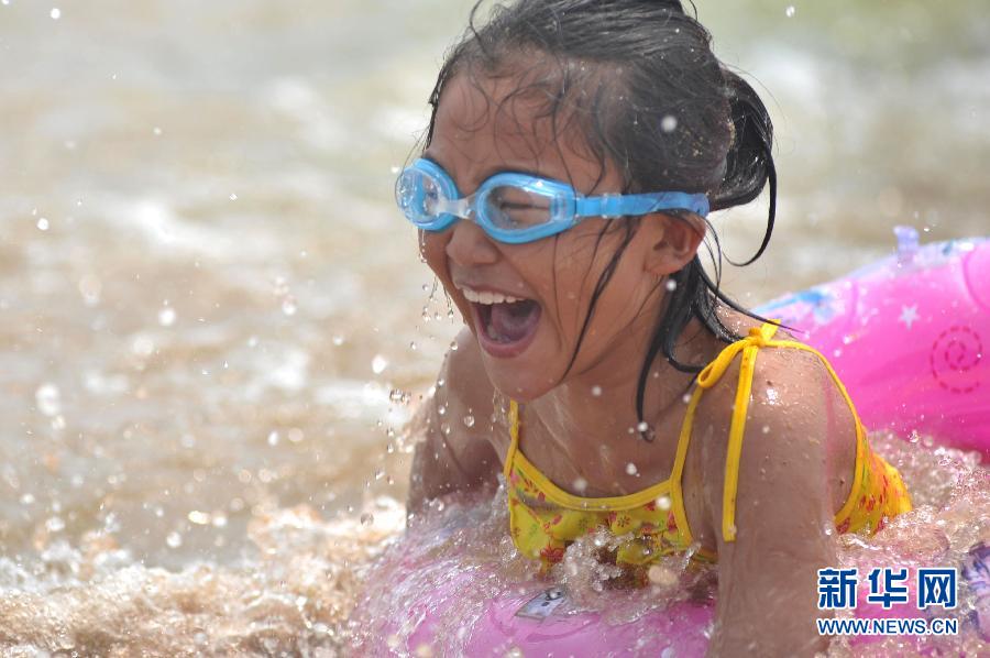 7月27日,一名小女孩在青岛沿海一处浴场戏水。近日,受酷暑高温天气影响,山东省青岛市沿海各浴场游客数量猛增。 新华社发(王海滨 摄)