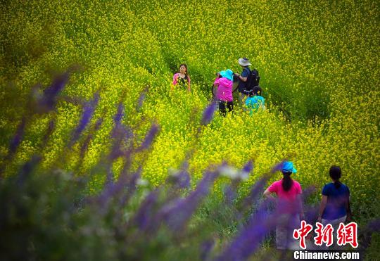 远道而来的游客置身在油菜花海中拍照留念。刘新 摄