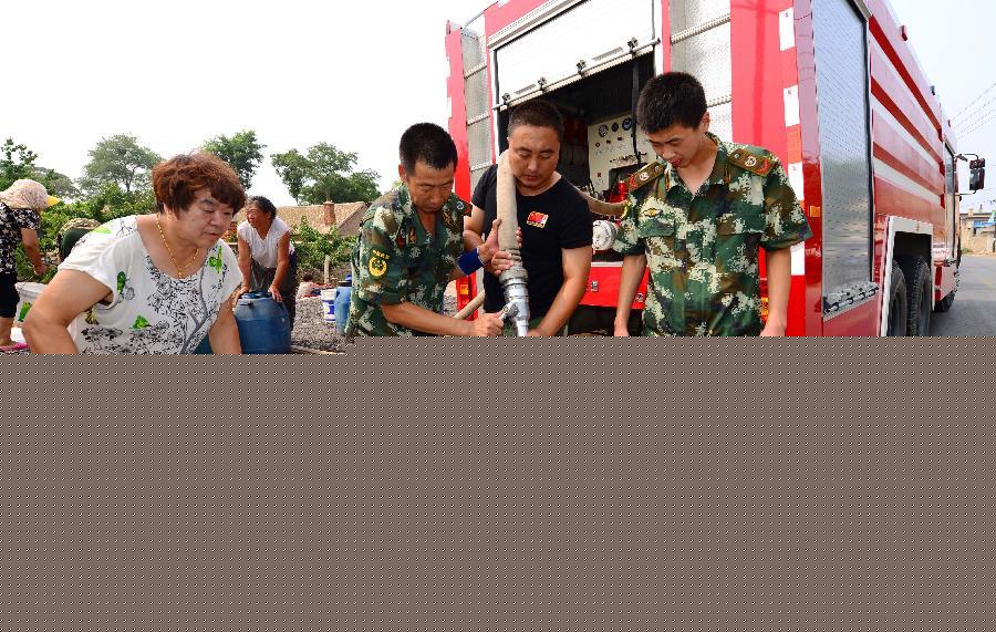7月28日,在辽宁省大连市金普新区大魏家街道荞麦山村,金州区消防大队金渤海岸中队消防队员为村民供水。 7月初以来,辽宁大连出现严重干旱。旱情造成金普新区荞麦山村300户村民出现生活用水困难。大连市消防局金州区消防大队派出消防车送水到村里,保障村民正常生活用水。新华社发(朴峰 摄)