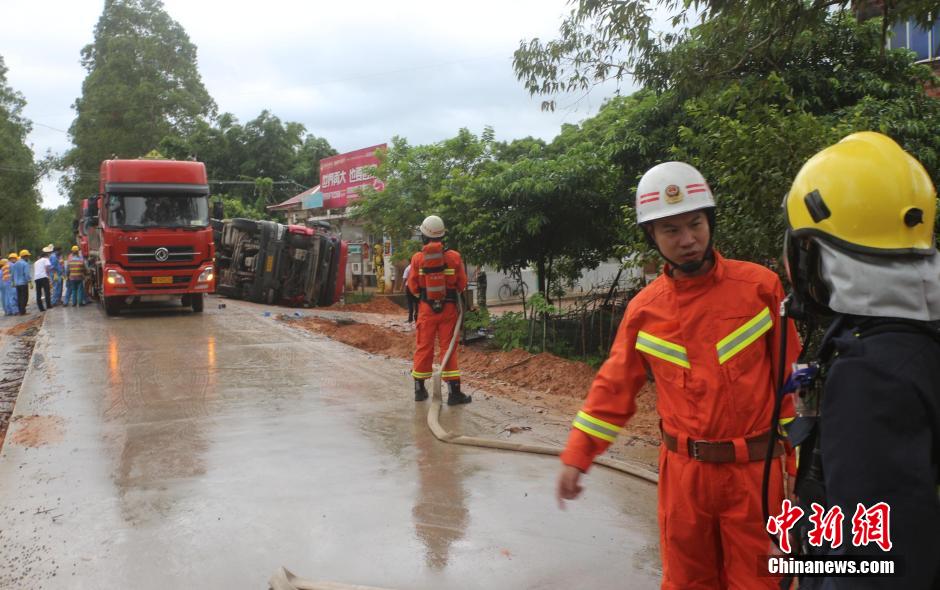图为事故现场,一辆槽罐车侧翻在路边。于海波 摄