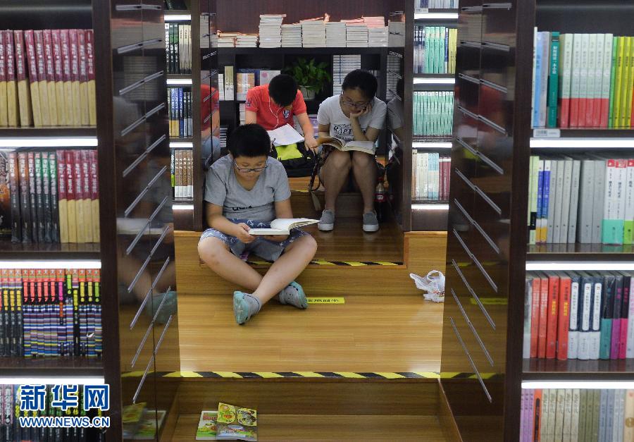 7月28日,几名读者在位于南京市新街口的新华书店内阅读图书。当日,江苏省南京市气象台发布高温黄色预警信号,预计未来三天,南京市日最高气温将达35摄氏度以上。不少学生和市民走进书店,在凉爽的环境里购书读书,“充电”纳凉两不误。新华社记者 季春鹏 摄