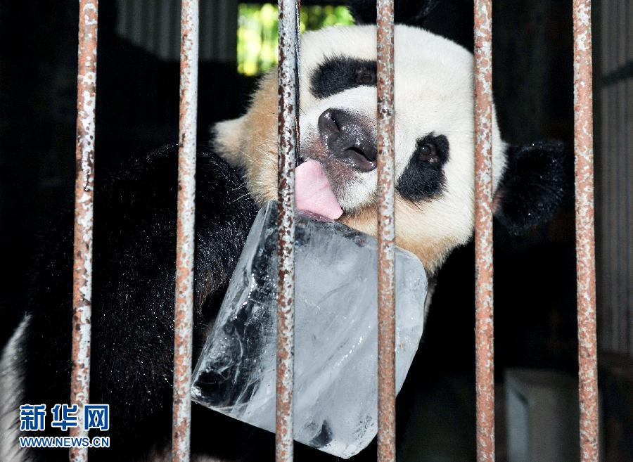 7月27日,成都大熊猫繁育研究基地里的一只大熊猫在“享用”冰块。近日成都持续高温,成都大熊猫繁育研究基地采取多项措施确保大熊猫清凉度夏。 新华社发(张磊 摄)