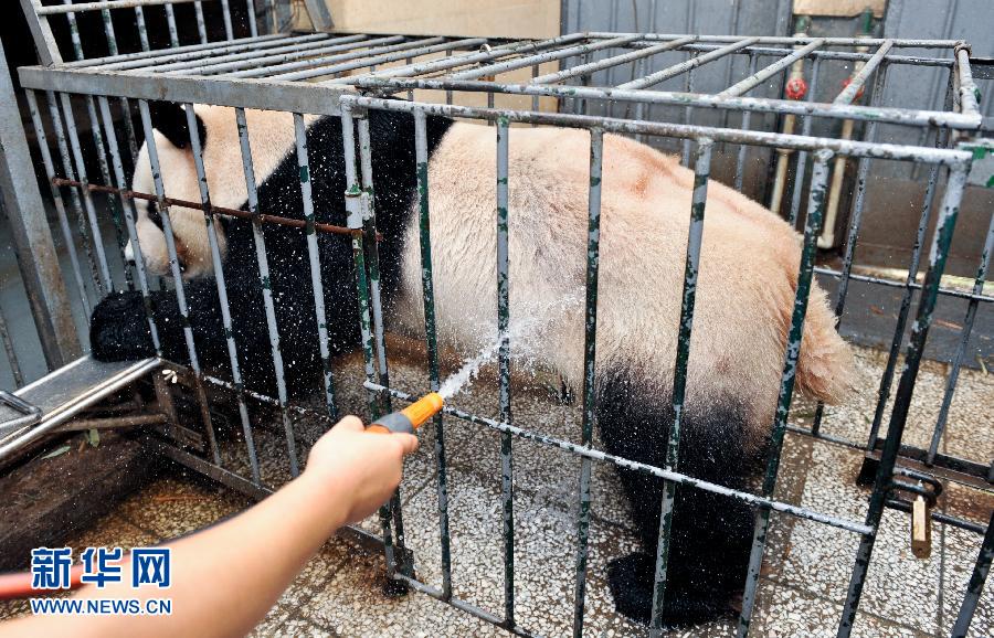 7月27日,成都大熊猫繁育研究基地的饲养员为一只大熊猫冲澡降温。近日成都持续高温,成都大熊猫繁育研究基地采取多项措施确保大熊猫清凉度夏。 新华社发(张磊 摄)