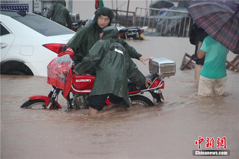 图为一名警察帮市民推行在积涝中熄火的摩托车。张振国 摄