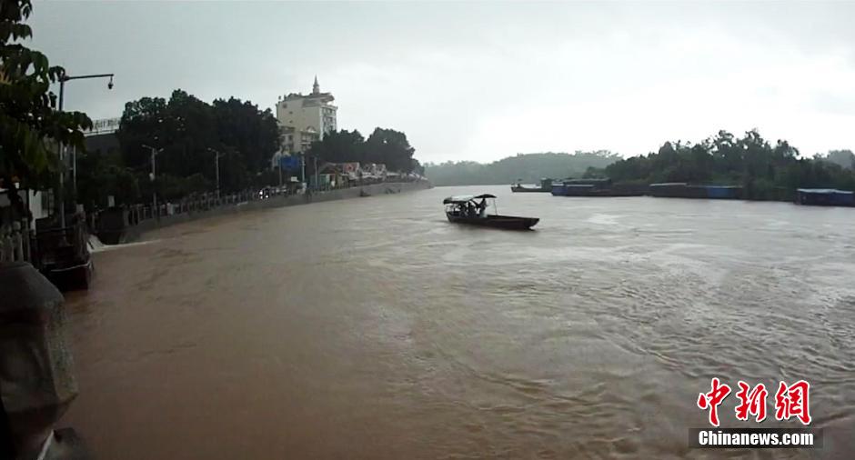 图为一艘小船穿行在水位暴涨的中越界河北仑河面。(钟欣 摄)