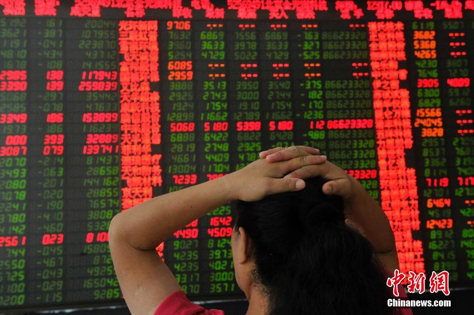 7月28日,山西太原一证券营业部,股民关注泛绿的股指大盘。当日沪指大幅低开4%,全天巨震逾6%,券商银行股强势护盘。截至当日收盘,沪指报3663.00点,跌幅1.68%,成交6851亿元,深成指报12316.78点,跌幅1.41%,成交6188亿元。两市超300只股票跌停。中新社发 韦亮 摄