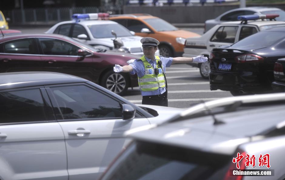 7月28日,重庆渝中区两路口段一指挥完交通后的民警喝着大瓶装的矿泉水解渴。当日,重庆市气象台发布“高温橙色预警”信号,渝中、大渡口、江北、九龙坡、南岸、沙坪坝、巴南、江津、璧山、万州、开县、奉节等区县日最高气温升至37℃以上。钟欣 摄