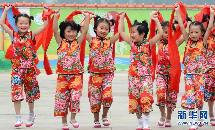 7月28日,山东省沂源县大张庄镇中心幼儿园的小朋友们在表演民族舞。紧张而繁忙的一个学期过去了,孩子们终于迎来了“拯救不开心”的暑假,那种好似“雨后见彩虹”的心情,真爽!暑假里最郁闷的事,不是玩得不够high,而是再不赶紧玩耍,假期就要结束啦!正所谓“无快乐不暑假”,小伙伴们快快走出家门,尽情享受暑假的快乐吧。新华社发(赵东山 摄)