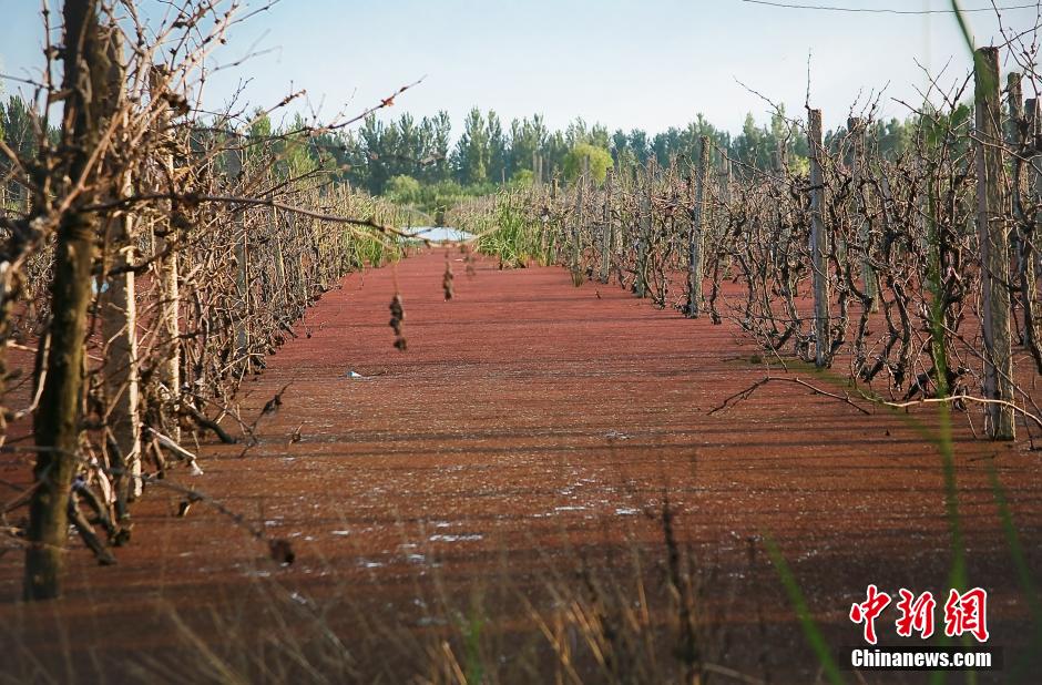 2015年7月29日,安徽淮北段园镇牛眠村农田里、葡萄园里一片泽国景象,水面水生藻类大量繁殖,果园里的水面上如同泼一层厚厚的红色油漆。据段园镇牛眠村村民讲述:安徽淮北矿业集团袁庄煤矿采煤致使牛眠村数百亩农田和果园塌陷,已经有四年之久,由于煤矿经营亏损,无钱征收牛眠村土地,一直搁置至今。牛眠村农田和葡萄园里塌陷低洼雨水排不出去,田地里成了水汪汪的泽国景象。农田里有的水深两米,葡萄树、园屋和庄家泡在水里。同时绿藻、红色水藻大肆繁殖,农田里的水面如同泼了一层红彩色油漆,景象煞是壮观。 中新社发 吴克涛 摄 图片来源;CNSPHOTO