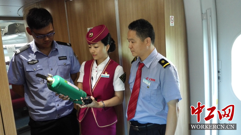 “安全”是永恒的主题。为了保证列车安全正点和旅客生命财产安全。每趟值乘任务开始前,列车长王娇珑携同机械师和乘警,认真检查列车设备设施以及重点部位,确保万无一失。(王真 摄)