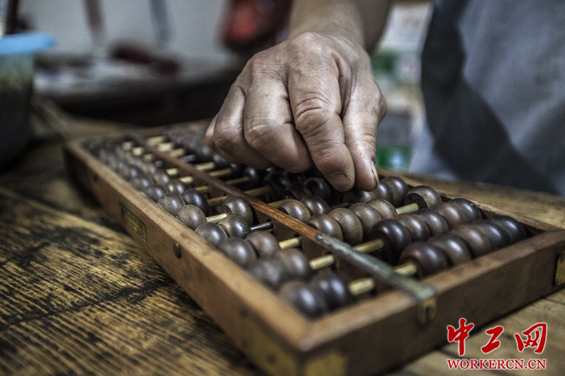 这么多年,店里的陈设几乎没变,一踏进店门就给人一种穿越的感觉。李瑞生现在依然习惯用算盘算账,这个老算盘已经跟了他三十年。中工网记者韩靖摄