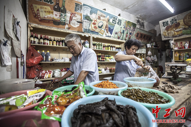 面对市场经济大潮的冲击,副食店的生意越来越差,但是李瑞生凭着多年的经验,把销售目标人群定位于附近老街坊。李瑞生的爱人(右)已经退休,经常到店里来帮忙。中工网记者韩靖摄