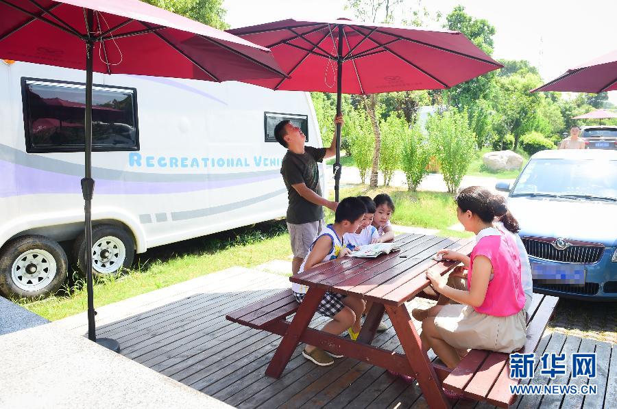 8月2日,在安徽省芜湖市龙山房车露营地,游客在房车前休闲聊天。暑期里,位于安徽芜湖的房车露营地吸引省内外游客目光,房车客房预订量显著上涨。 新华社记者 杜宇 摄