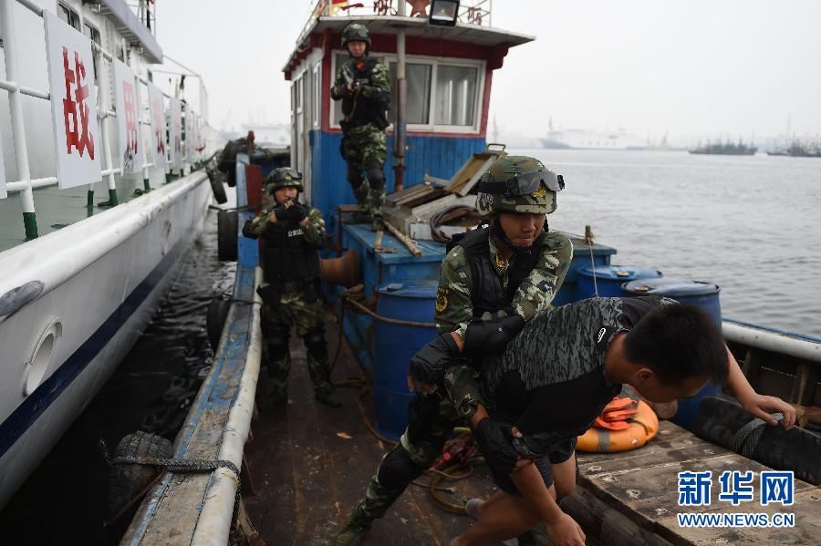 8月2日,大连边防官兵在进行制服歹徒演练。当日,大连边防开展海上处突演练。演练包括险情发现与指挥、截停船只、紧急登船、解救人质、制服歹徒等课目,强化边防官兵处理海上突发事件的能力,更好地保障航运人员的生命及财产安全。新华社记者 潘昱龙 摄