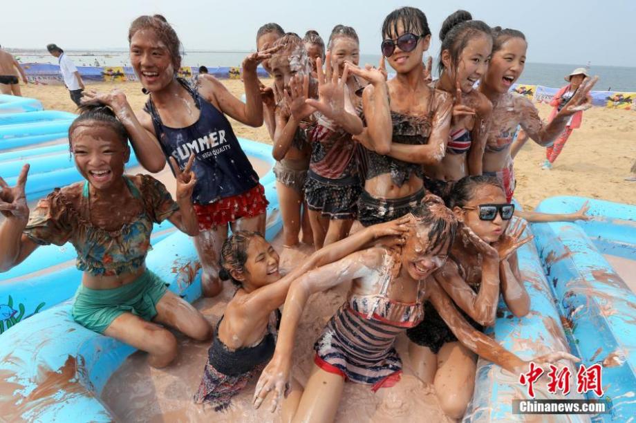 8月1日,山东省潍坊市,游客在泥浆地里嬉戏玩耍。当日,山东省潍坊滨海欢乐海沙滩举办了一场别开生面的泥浆节活动,游客在泥浆中尽情嬉戏、狂欢,释放压力,享受夏日的欢乐和清凉。中新社发 张驰摄