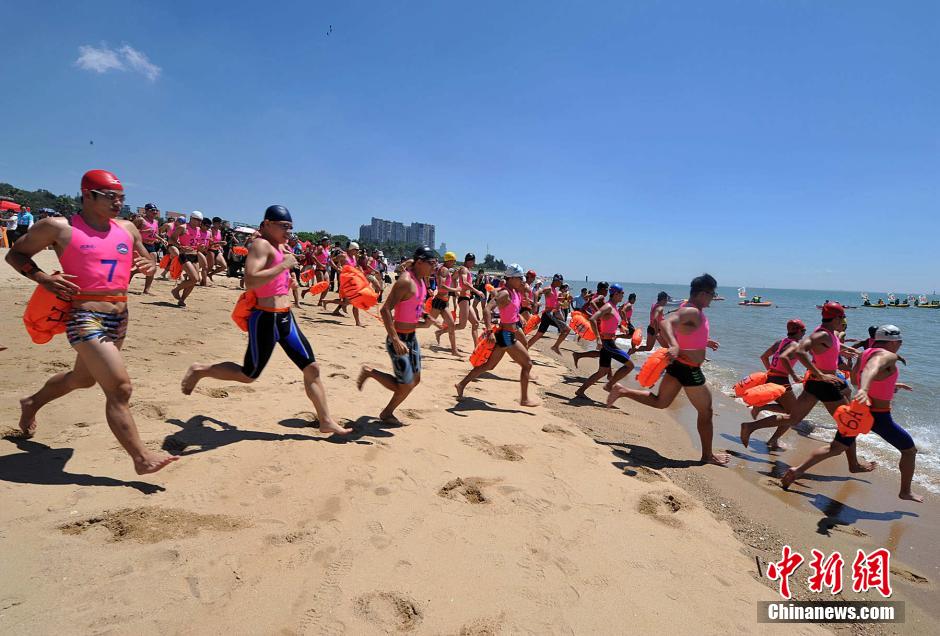 8月1日,参赛选手在发令枪响后奔向大海,泳渡金门。张斌 摄