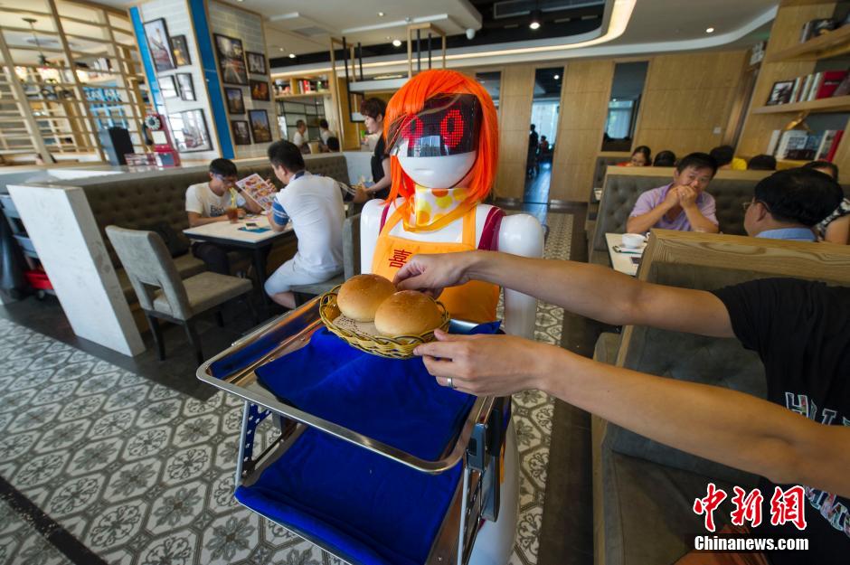 客人取走机器人所携带的菜品。中新社发 骆云飞 摄