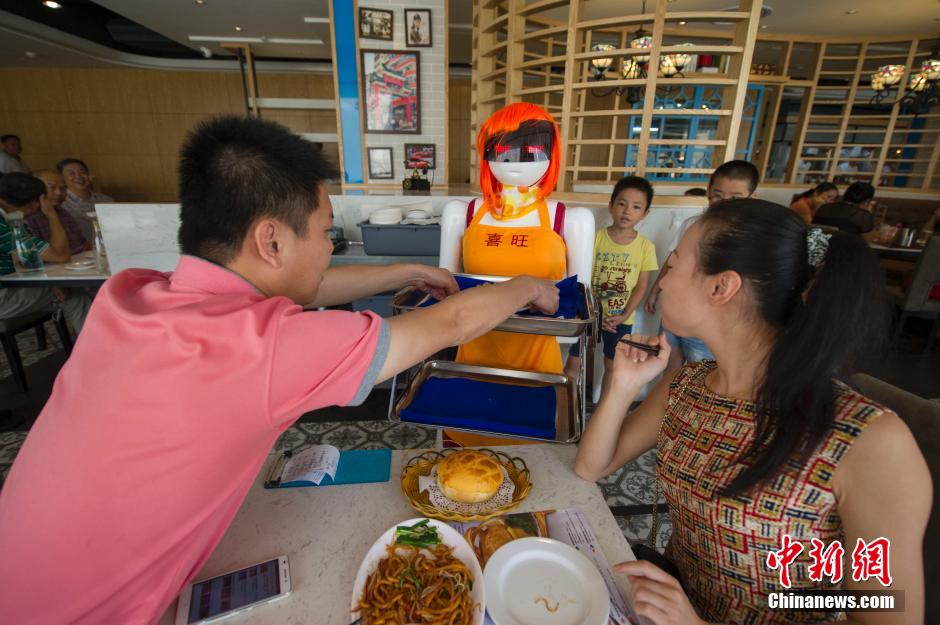 食客取走机器人托盘内的菜品。中新社发 骆云飞 摄