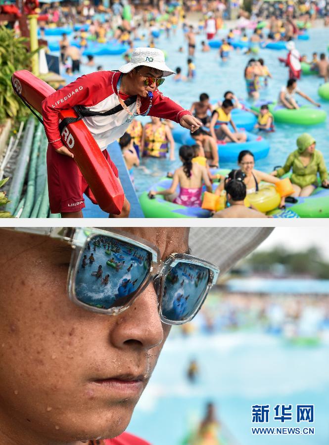 【泳池边的“超人”】上图:7月15日,广州一家水上乐园的救生员戴日斌在园区造浪池旁提醒游客注意安全;下图:7月15日,一家水上乐园的救生员戴日斌满脸汗水,全神贯注关注着水中游客的安全(拼版照片)。 8月的广东再度开启高温模式,广州等地出现了35—37摄氏度的高温。广州闷热的午后,连坐在树下乘凉都觉得燥热。在广州一家水上乐园内,举目望去,各个泳池内满是前来嬉水消暑的游客们。但有一群人却是例外,烈日暴晒下,他们聚精会神地守护在一旁,与游客们的嬉闹形成了鲜明的对比。天气越热,游客就越多,他们就越紧张。 23岁的江西小伙儿戴日斌就是100多位专职救生员中的一个。只见他一直保持着低头不停俯身巡视的姿态,眼睛一刻也不敢离开水面。由于注意力高度集中,戴日斌显得有些疲惫。发现有人需要帮助时,他如同离弦之箭冲了过去。“这种时候,我觉得特别有成就感,就像‘超人’一样。”戴日斌笑称,由于每天在烈日下要暴晒八九个小时,白净的肤色正变得“越来越健康”。新华社记者 刘大伟 摄