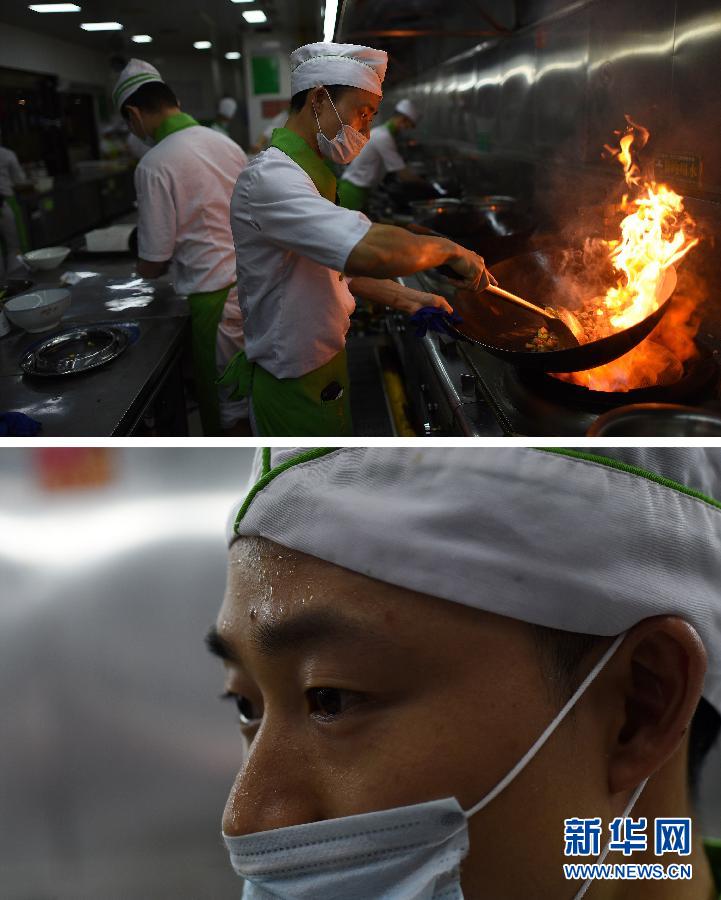 【制作美味的“桑拿间”】上图:7月29日,赵小冬在长沙某餐厅厨房里工作;下图:7月29日,在长沙某餐厅厨房里工作的厨师长赵小冬满头是汗(拼版照片)。湖南在经历了一个较为凉爽的7月后,大范围高温天气在8月“光临”了,大部分地区出现了35摄氏度以上的高温。中午就餐高峰时分,27岁的赵小冬所主厨的湖南一家餐厅坐满了食客。在这里,他平均每天要为顾客烹饪出60多道可口的菜肴。人们觥筹交错品尝着美食,难以想象后厨是怎样的景象:厨房里12个炒锅同时开伙,厨房里湿度大水汽重,让人恨不得夺门而出。越靠近灶台边越觉得热,实测后发现温度在50摄氏度以上。“我管这叫‘蒸桑拿’,已经习惯了。”赵小冬边说边熟练地掂着一个6斤多重的炒锅,“听到顾客称赞菜好吃时,再累再热也有成就感。” 新华社记者 李尕 摄